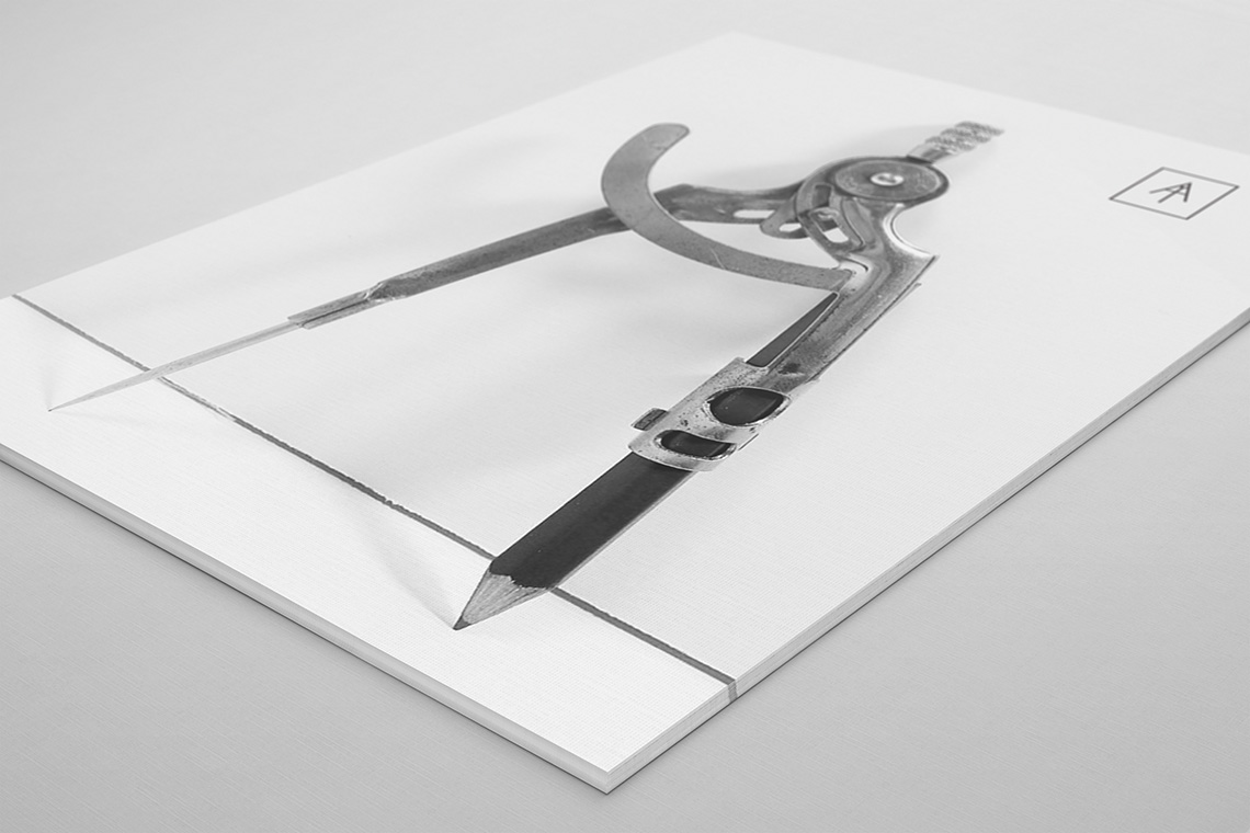 A compass and pencil may not be the most novel imagery to associate to an independent London based architect. They had already chosen Futura as their typeface, which presented a very interesting coincidence when working with the graphic.
